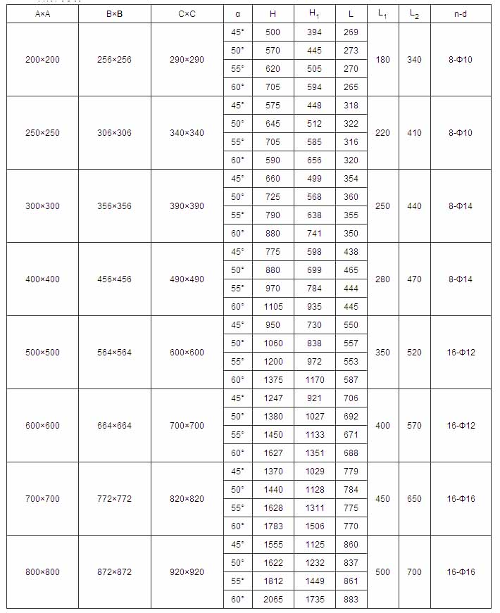 | 700×700 | 772×772 | 820×820 | 45° | 617 | 380 | 450 | 630 | 16-Ф16 | DTⅡA500-M | 0.75 |