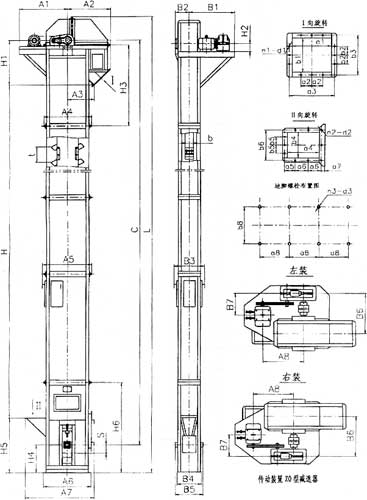 TH型斗提機外形見圖2,其尺寸見表7、驅(qū)動裝置配套及相關(guān)尺寸見表9。