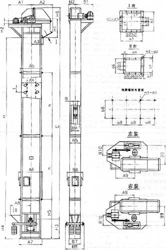 (1)傳動裝置 TD型斗提機的傳動裝置有兩種形式,分別配有YZ型減速型或ZQ(YY)型減速器。YZ型軸裝減速器直接套裝在主軸軸頭上,省去了傳動平臺、聯(lián)軸器等,使結(jié)構(gòu)緊湊,重量輕,而且其內(nèi)部帶有異型輥逆止器,逆止可靠。該減速器噪聲低,運轉(zhuǎn)平穩(wěn),并隨主軸浮動,可消除安裝應(yīng)力。(2)TD型斗提機備有四種料斗:Q型(淺斗)、H型(弧底斗)、Zd型(中深斗)、Sd型(深斗)